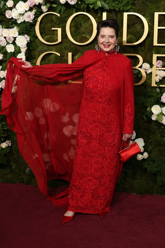 Red was another popular colour this year; Isabella Rossellini wore a fabulous lace dress and a sheer cape in the scarlet hue.
