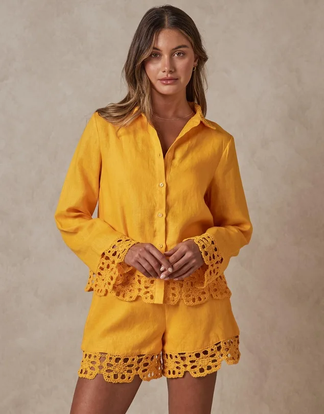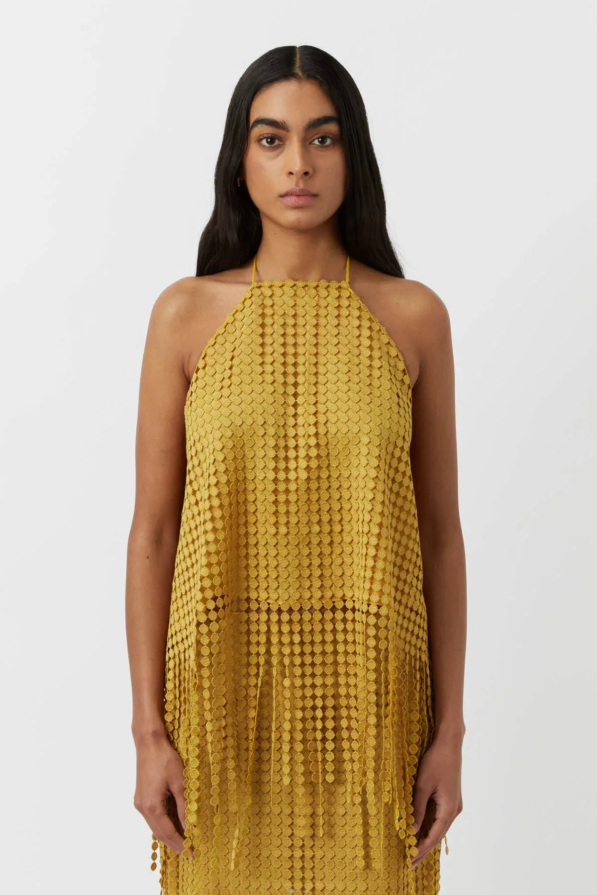 You deserve to splurge. In citron yellow, this summer top is crafted from intricate lace and exudes an ethereal charm.