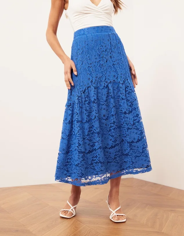 In striking cornflour blue, this lined midi skirt with lace detail will be one of your favourite additions to your wardrobe.