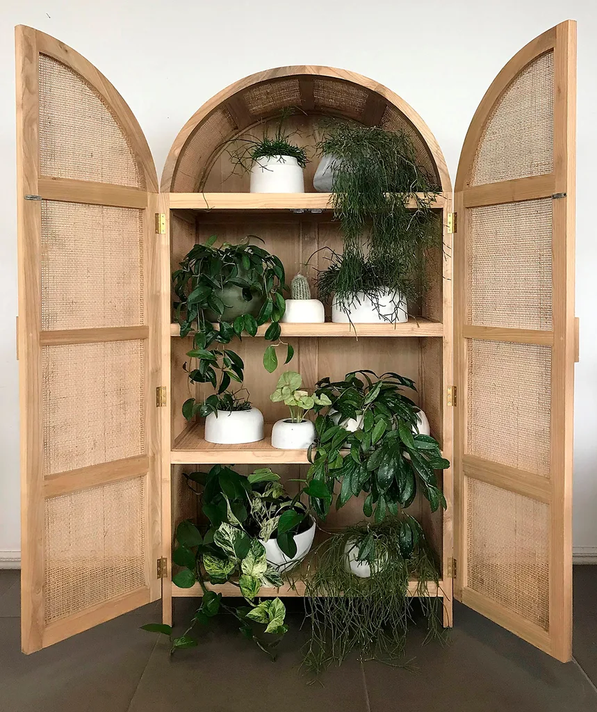 There are endless ways to display your plants outside of a pot on the floor or table. An open cupboard can become a greenhouse; any shelf or ledge can accommodate plants big or small. “Any plant that grows on the floor will grow in a hanging pot – they don’t have to only be trailing plants,” Craig points out.