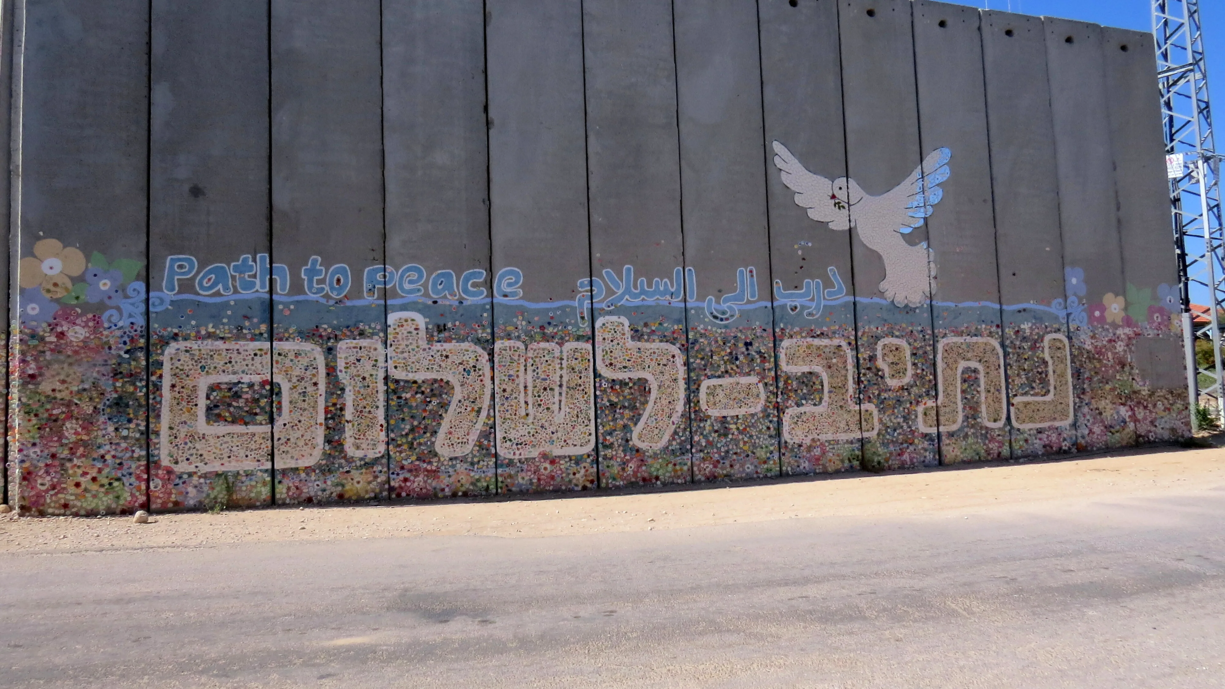 Part of the Gaza barrier bisects a hill not far from Roni’s home. Roni’s neighbour, Tsameret Zamir, has decorated it with a peace mosaic created from her own homemade ceramic tiles. Visitors add tiles too, expressing what she calls their wish for “hope, love and happiness among all people”.
