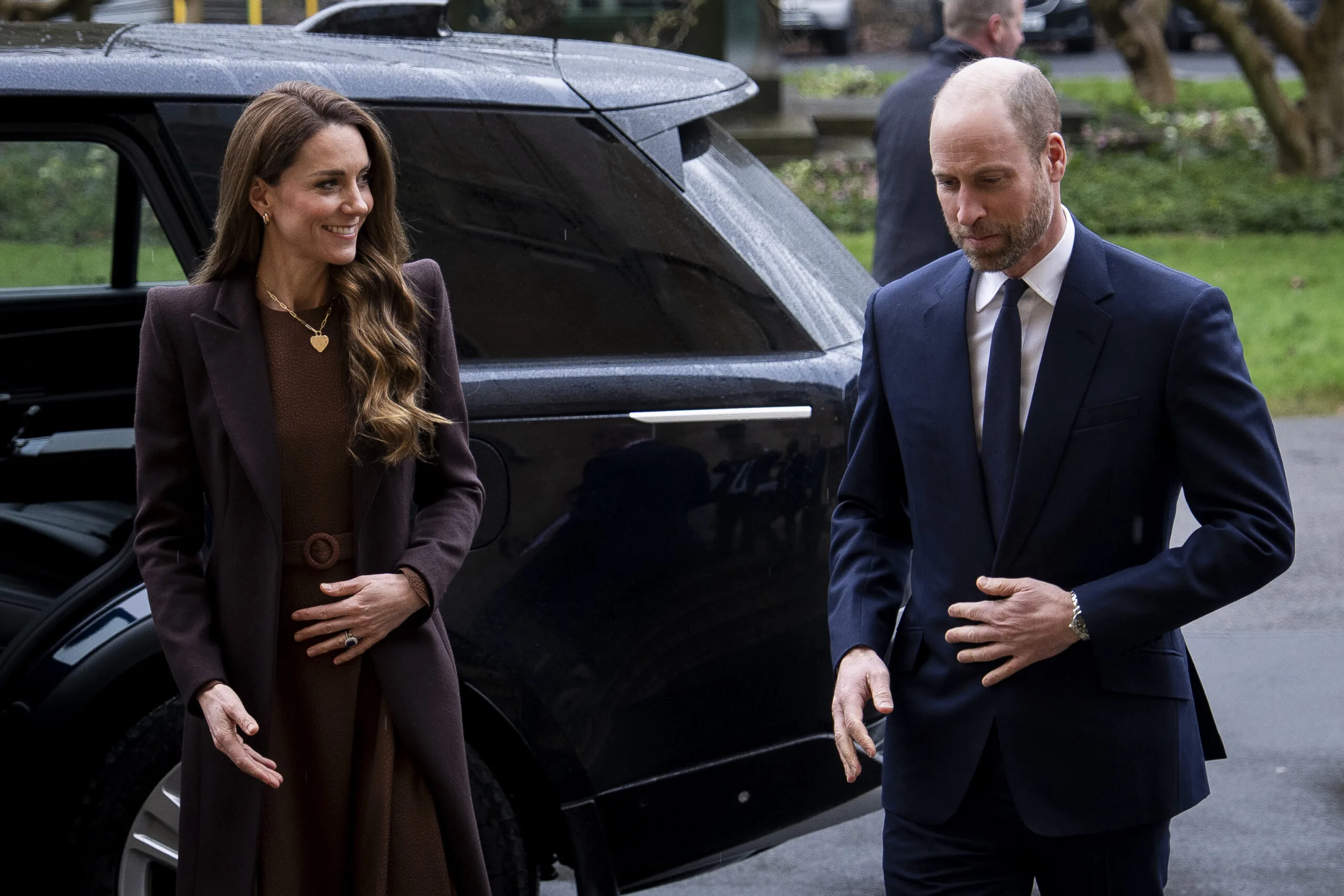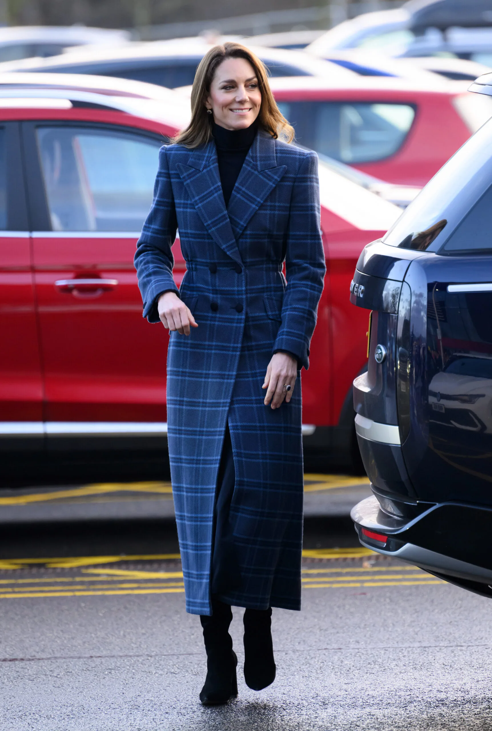 Princess Catherine was undeniably appropriately dressed for the occasion, wearing a blue tartan coat by Chris Kerr and suede boots from Gianvito Rossi, paired with diamond and sapphire earrings to match her engagement ring.