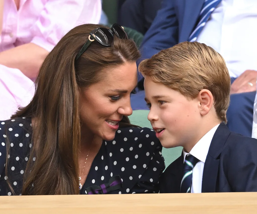 George shares a secret with mum Catherine at Wimbledon.